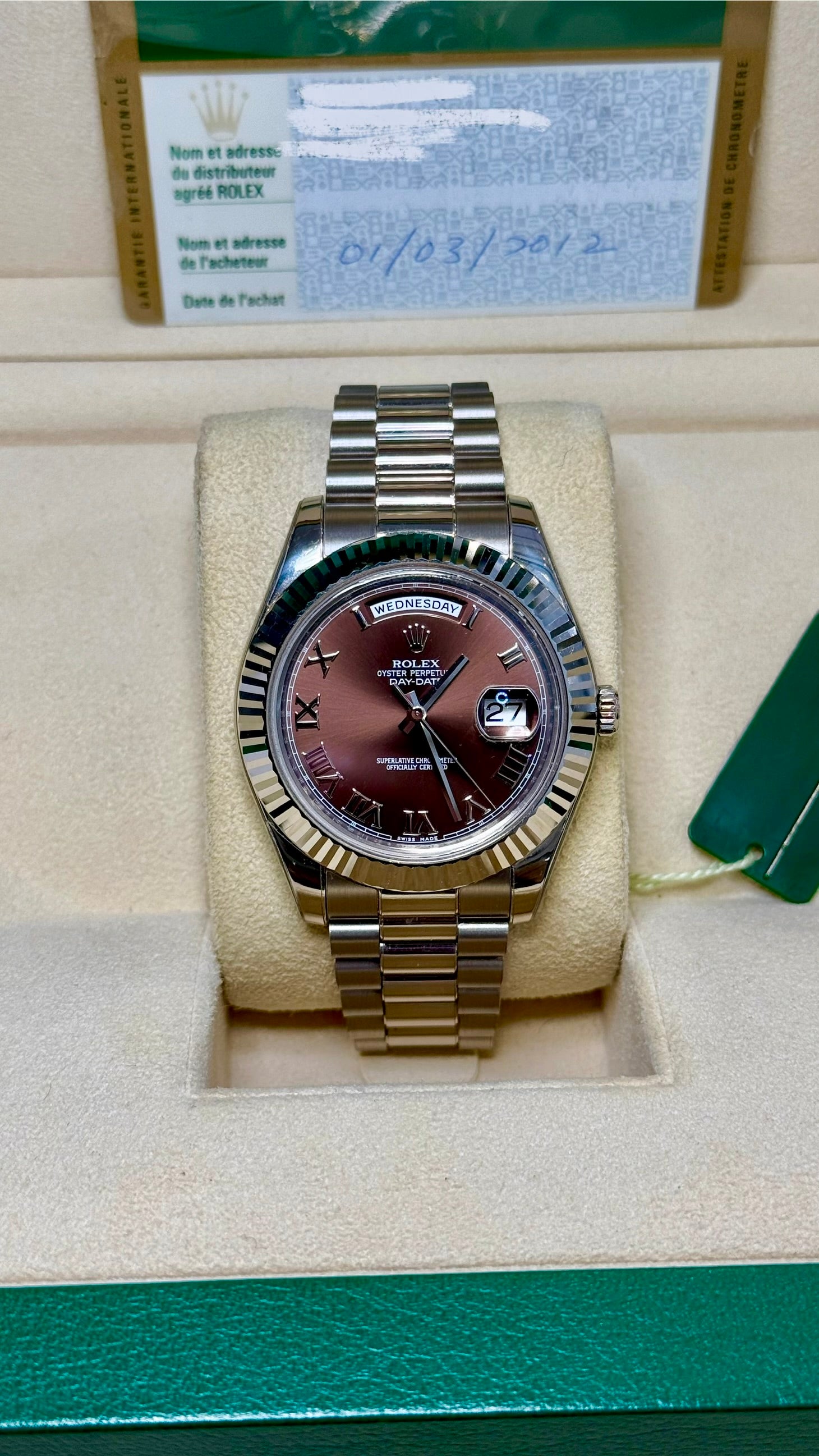 Rolex Day-Date II Brown Dial on Leather Strap 218239 Card 2012