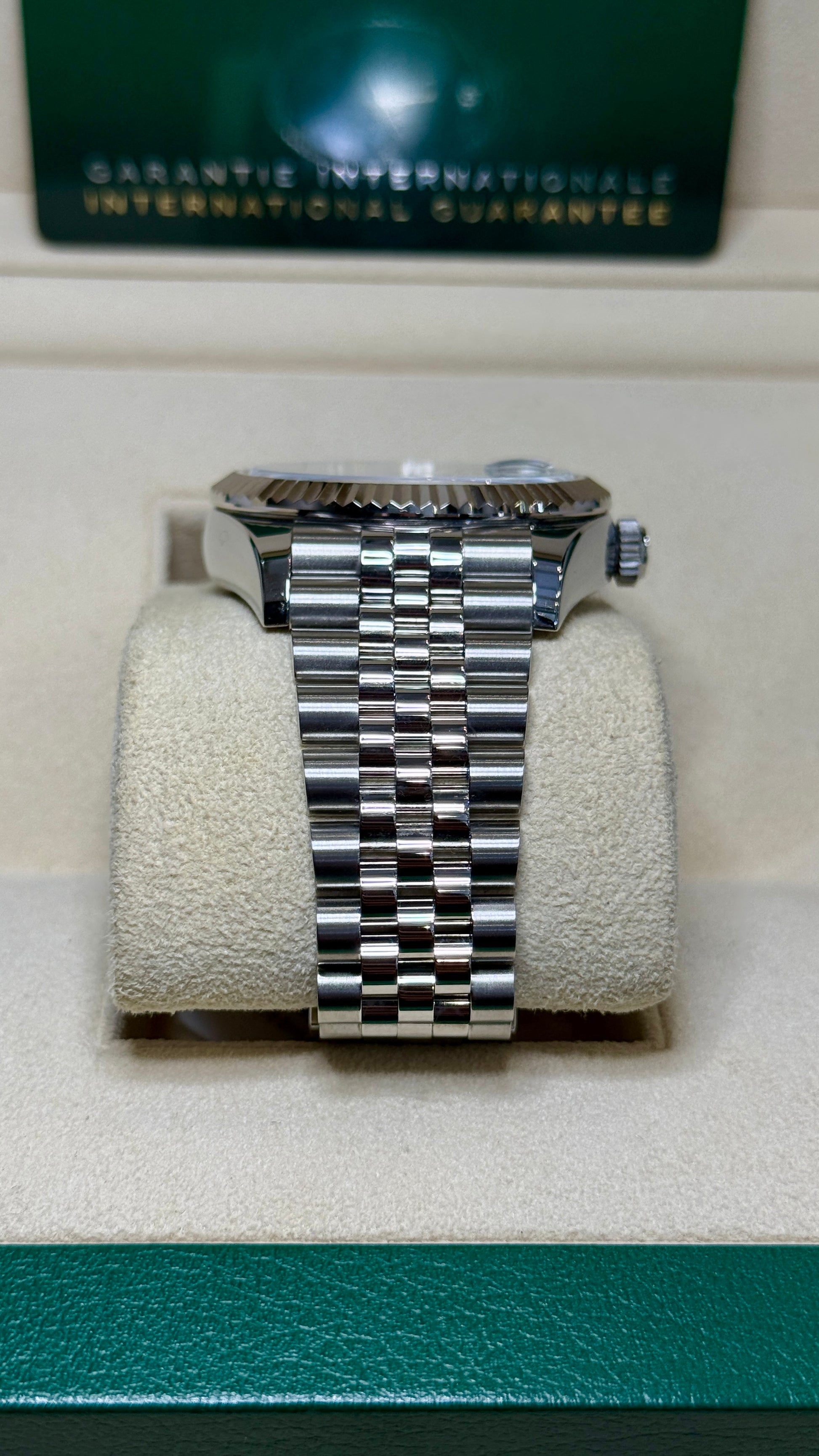 The Rolex Sky-Dweller is a sophisticated watch designed for travelers, combining robust functionality with an elegant aesthetic. Featuring a striking bright blue dial and a signature fluted bezel, this timepiece is crafted with Oystersteel and white gold, standing out as an exemplar of luxury and precision.
